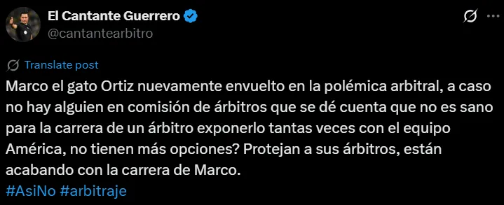 Este hecho motivó la reacción de Fernando Guerrero, ex árbitro y actual analista en TUDN. Al respecto, el Cantante escribió un contundente mensaje en su cuenta personal de X (ex Twitter) mediante el cual advirtió a la Comisión de Árbitros y señaló que el organismo está poniendo en riesgo la carrera de su otrora colega al designarlo en partidos del conjunto azulcrema.