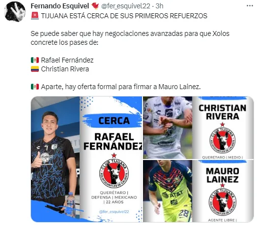 Además de mencionar el posible futuro de Mauro Lainez, la fuente citada afirmó que Tijuana está cerca de incorporar a dos futbolistas de Querétaro: Rafael Fernández, defensa mexicano de 22 años; y Christian Rivera, mediocampista colombiano de 27, podrían conventirse en Xolos para el Apertura 2023.