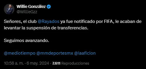 Sin embargo, hace instantes, la Federación Internacional de Futbol Asociación falló a favor de Rayados en esta cuestión legal que involucró al equipo de la Liga MX y a un club argentino, y por lo tanto levantó la inhibición declarada inicialmente, según informó el periodista Willie González.