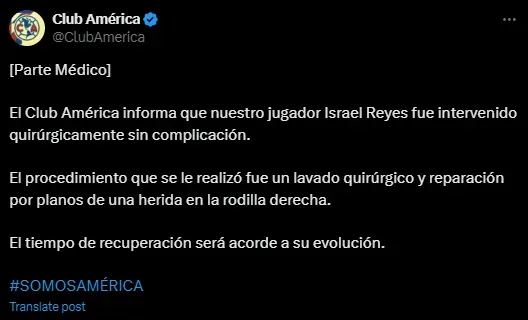 Por el momento, el América no ha anunciado cuánto le llevará su evolución y se desconoce cuándo volverá a jugar con las Águilas, aunque comparado a lesiones óseas o musculares, representa una cuestión menor.