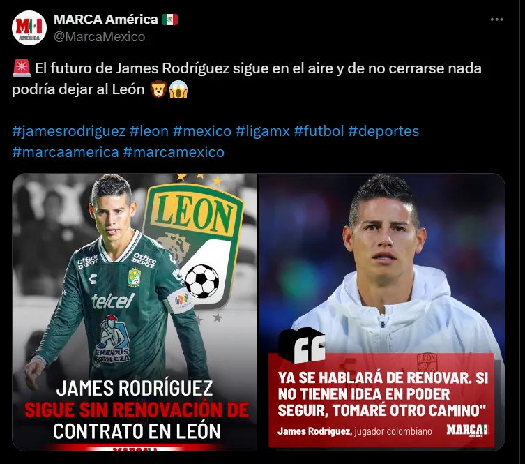 Sin embargo, La Fiera ahora está pasando por una importante crisis futbolística. Desde hace semanas se habla sobre lo que será el futuro de James, ya que su vínculo con el equipo mexicano es hasta diciembre de 2025 y por el momento no hubo avances para renovar.
