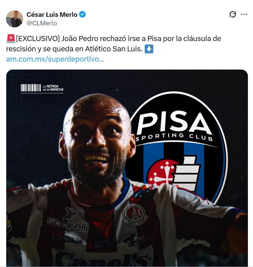 ”Súper Deportivo pudo saber que Pisa buscaba que el goleador brasileño hiciera válida su cláusula de salida, pero João decidió no marcharse del Atlético de San Luis. Uno de los motivos para quedarse en el equipo de San Luis Potosí es porque está contento con el proyecto deportivo”, reveló el periodista en Súper Deportivo.