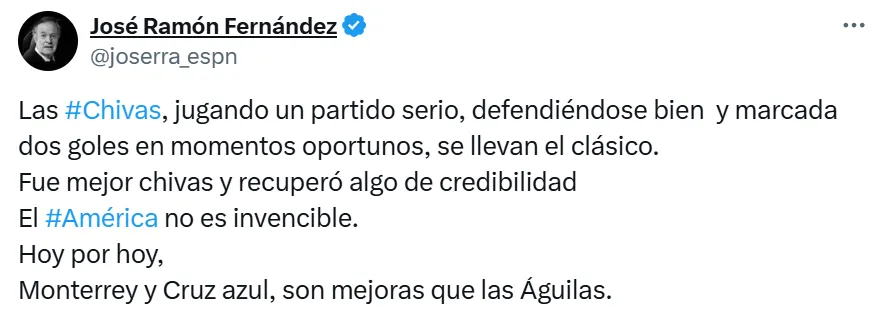 “Las Chivas, jugando un partido serio, defendiéndose bien y marcando dos goles en momentos oportunos, se llevan el clásico. Fue mejor Chivas y recuperó algo de credibilidad”, comentó Fernández, destacando el nivel del Rebaño Sagrado.