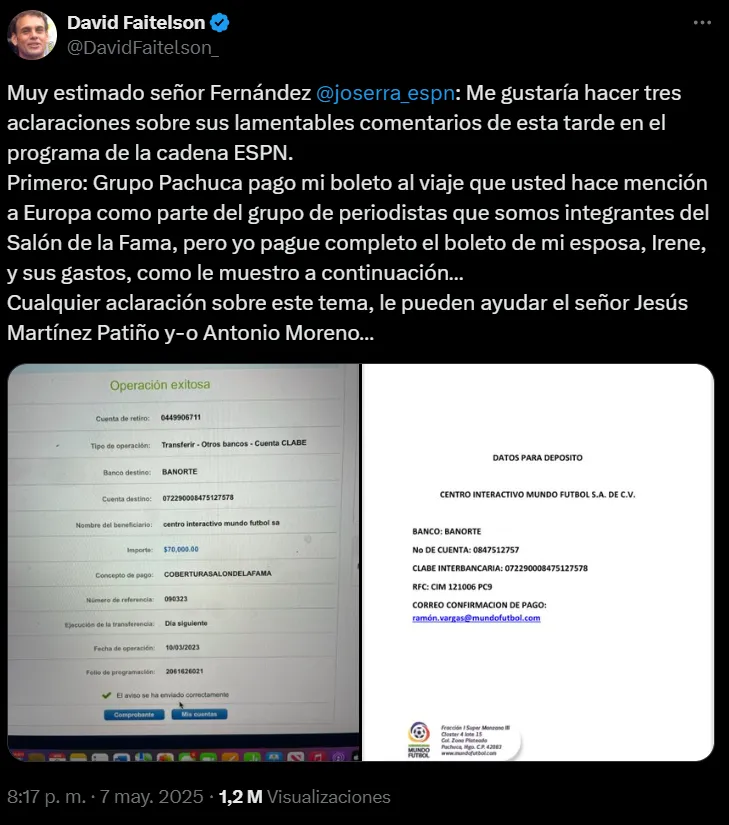 “Muy estimado señor Fernández @joserra_espn: Me gustaría hacer tres aclaraciones sobre sus lamentables comentarios de esta tarde en el programa de la cadena ESPN. Primero: Grupo Pachuca pagó mi boleto al viaje que usted hace mención a Europa como parte del grupo de periodistas que somos integrantes del Salón de la Fama, pero yo pagué completo el boleto de mi esposa, Irene, y sus gastos, como le muestro a continuación…”, escribió Faitelson.