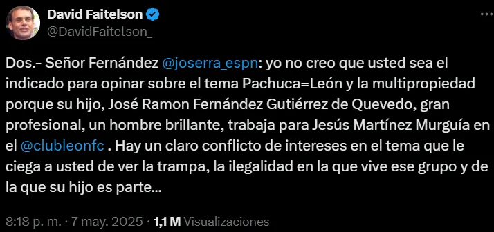 También lo señaló por un aparente conflicto de intereses. “Señor Fernández @joserra_espn: yo no creo que usted sea el indicado para opinar sobre el tema Pachuca=León y la multipropiedad porque su hijo, José Ramón Fernández Gutiérrez de Quevedo, gran profesional, un hombre brillante, trabaja para Jesús Martínez Murguía en el @clubleonfc. Hay un claro conflicto de intereses en el tema que le ciega a usted de ver la trampa, la ilegalidad en la que vive ese grupo y de la que su hijo es parte…”.