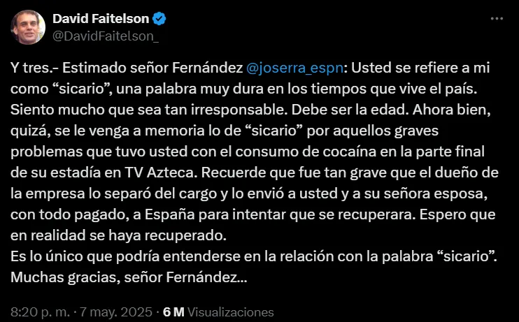 La respuesta más fuerte vino cuando Faitelson abordó directamente el insulto de “sicario”. “Estimado señor Fernández @joserra_espn: Usted se refiere a mí como ‘sicario’, una palabra muy dura en los tiempos que vive el país. Siento mucho que sea tan irresponsable. Debe ser la edad. Ahora bien, quizá, se le venga a memoria lo de ‘sicario’ por aquellos graves problemas que tuvo usted con el consumo de cocaína en la parte final de su estadía en TV Azteca. Recuerde que fue tan grave que el dueño de la empresa lo separó del cargo y lo envió a usted y a su señora esposa, con todo pagado, a España para intentar que se recuperara. Espero que en realidad se haya recuperado. Es lo único que podría entenderse en la relación con la palabra ‘sicario’. Muchas gracias, señor Fernández…”.