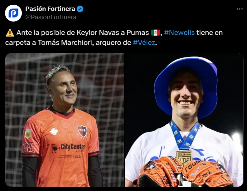 Según el periodista César Luis Merlo, ya hay negociaciones entre Keylor y Pumas, pero por el momento Newell’s Old Boys no tiene intenciones de desprenderse del futbolista de 38 años. No obstante, el medio Pasión Fortinera reveló que la directiva de la Lepra tomó la decisión de sondear al guardameta argentino Tomás Marchiori -de Vélez Sarsfield- como posible reemplazo de Navas ante una hipotética salida rumbo a la Liga MX.