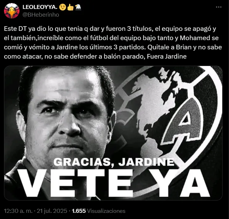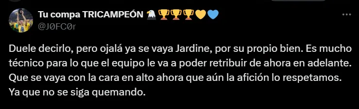 “Duele decirlo, pero ojalá ya se vaya Jardine, por su propio bien. Es mucho técnico para lo que el equipo le va a poder retribuir de ahora en adelante. Que se vaya con la cara en alto ahora que aún la afición lo respetamos. Ya que no se siga quemando”, agregó otro. “Ahora sí ya se puede ir Jardine o todavía no? Ya me tiene harto”, dijo otro más.