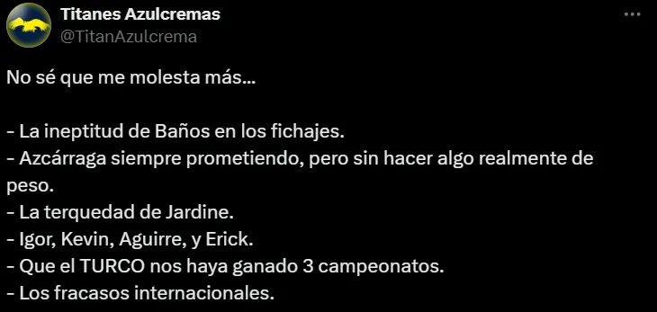 “No sé qué me molesta más… La ineptitud de Baños en los fichajes. Azcárraga siempre prometiendo, pero sin hacer algo realmente de peso. La terquedad de Jardine. Igor, Kevin, Aguirre, y Erick. Que el TURCO nos haya ganado 3 campeonatos. Los fracasos internacionales…”, cerró otro aficionado.