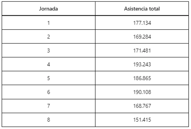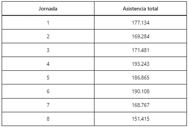 La octava jornada del certamen nacional, jugada a media semana, dejó los peores registros de asistencia a los estadios en lo que va de la competencia. En los nueve encuentros del calendario se contabilizaron un total de 151.415 personas de acuerdo con cifras oficiales aportadas por la Liga MX.