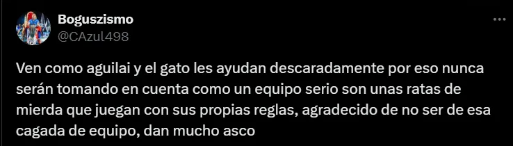 “Ven cómo Aguilai y el Gato les ayudan descaradamente, por eso nunca serán tomados en serio, son unas r*** de m**** que juegan con sus propias reglas. Agradecido de no ser de esa c***** de equipo, dan mucho asco”, expresó el seguidor de La Máquina.