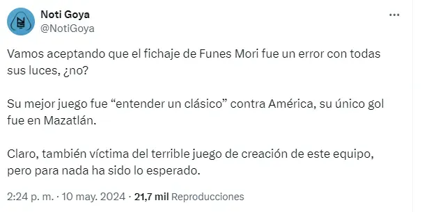 Los cuestionamientos hacia el argentino se relacionan con su falta de gol. Recordemos que Rogelio Funes Mori fichó este año con Pumas luego de jugar casi una década con Rayados y se esperaba que el delantero le aportara efectividad a los auriazules, algo que por el momento no está ocurriendo.