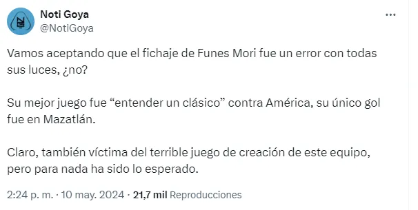 Ahora los Felinos necesitan ganar por al menos tres goles de diferencia este domingo para avanzar a las semifinales del Clausura 2024, y es en este aspecto donde Rogelio Funes Mori es más criticado por los aficionados.