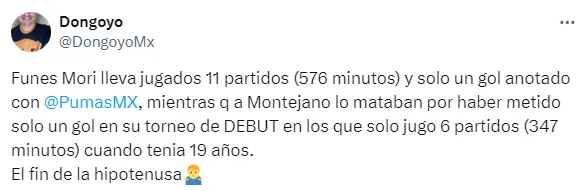 Funes Mori disputó 12 partidos con la playera de Pumas hasta el momento y solo convirtió un tanto: fue el 5 de abril en el triunfo por 4-0 ante Mazatlán por la jornada 14 de la Liga MX.
