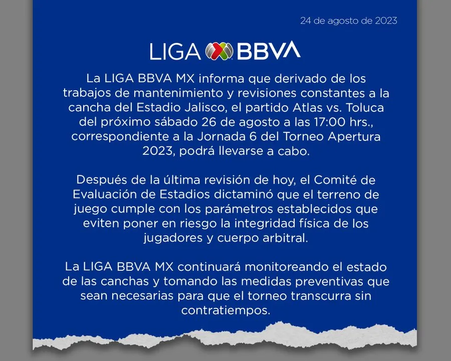 Tras intensos trabajos de mantenimiento y revisiones constantes, la Liga BBVA MX ha confirmado que el partido entre Atlas y Toluca, correspondiente a la jornada 6 del Torneo Apertura 2023, se llevará a cabo en el Estadio Jalisco.