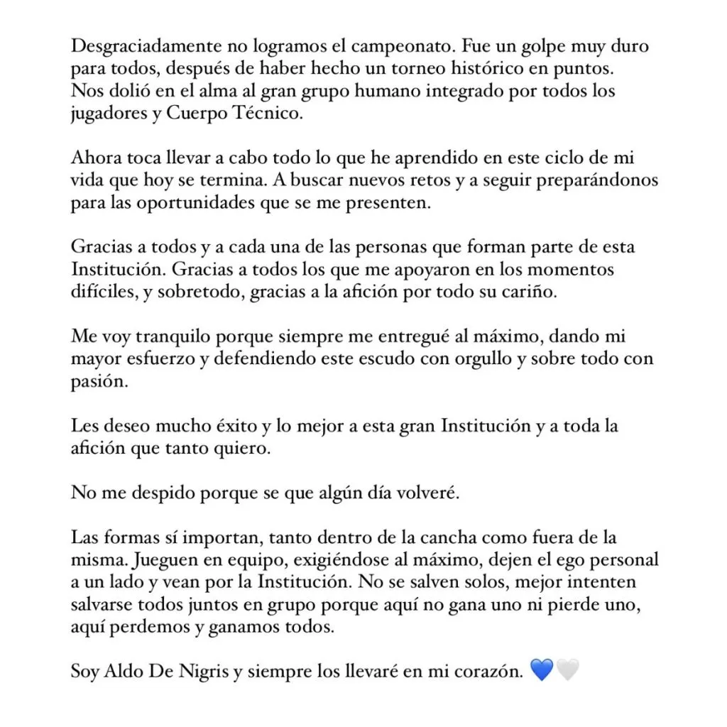 Más adelante, Aldo apuntó con contundencia: “Las formas sí importan, tanto dentro de la cancha como fuera de la misma. Jueguen en equipo, exigiéndose al máximo, dejen el ego personal a un lado y vean por la Institución. No se salven solos, mejor intenten salvarse todos juntos en grupo porque aquí no gana uno ni pierde uno, aquí perdemos y ganamos todos“.
