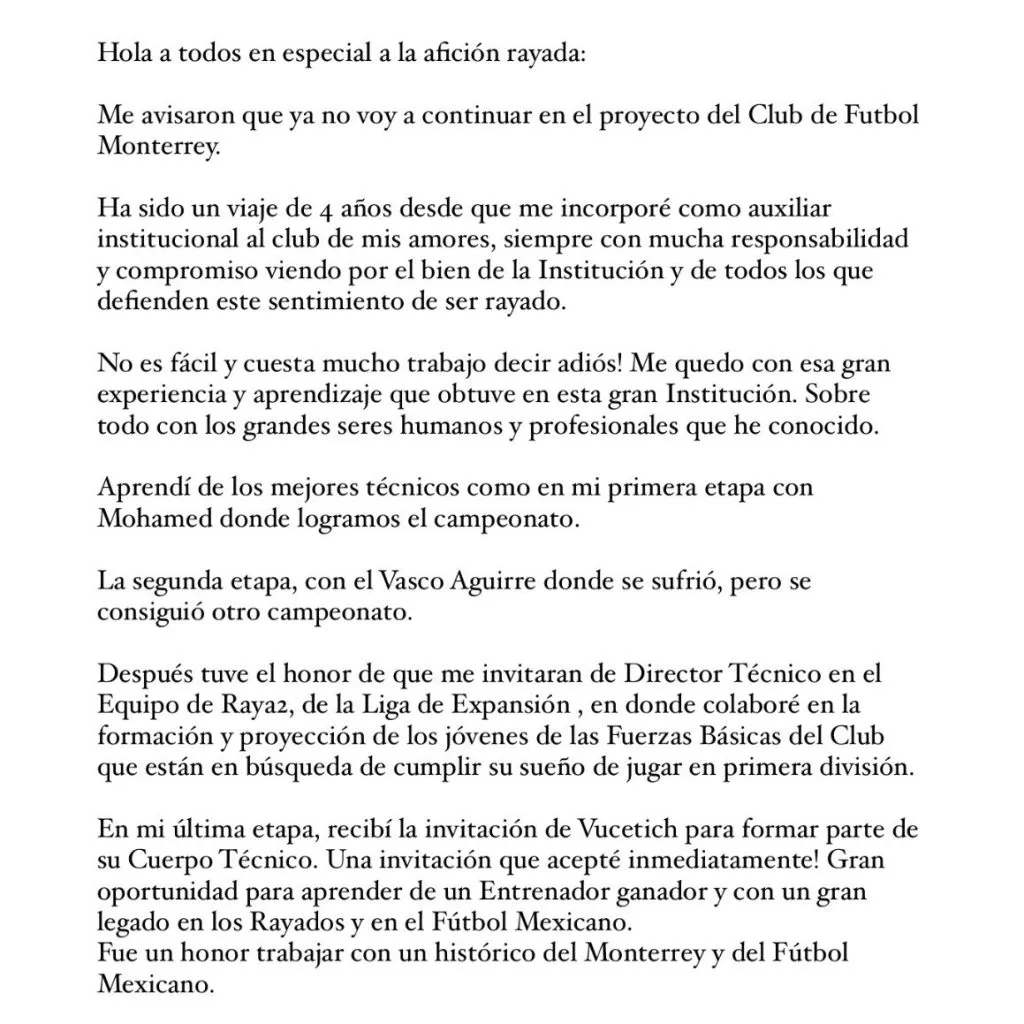 “Me avisaron que ya no voy a continuar en el proyecto del Club de Futbol Monterrey”, señaló el hombre que trabajó durante los últimos 4 años en el equipo. Colaboró con Antonio Mohamed, Javier Aguirre y Víctor Manuel Vucetich, pero ya no estará para acompañar al Tano Ortiz por decisión de la directiva.