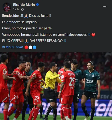 Con la clasificación de Chivas ya consumada, Ricardo Marín no olvidó su encontronazo con Alexis Vega, y lanzó un fuerte mensaje en las redes sociales. “La grandeza se impuso. Claro, no todos pueden ser parte. ¡Vamos hermanos! ¡Estamos en semifinales! Elijo creer, dale Rebaño”, escribió el futbolista del Guadalajara.