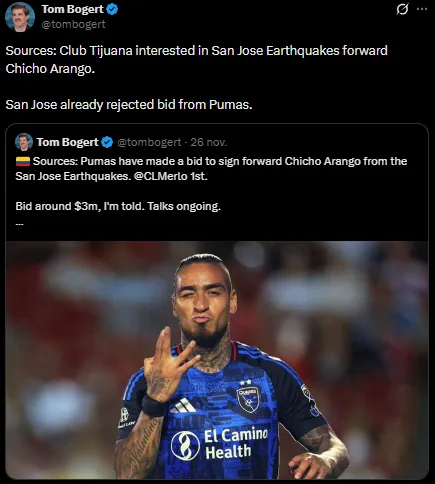 Sin embargo, este domingo, el insider de la MLS, Tom Bogert dio a conocer una mala noticia para la escuadra de la capital, ya que la oferta que hizo el conjunto universitario por Chicho Arango ha sido rechazada, por lo que no llegará al conjunto auriazul para el Clausura 2026, lo peor es que ahora los Xolos quieren ese fichaje.