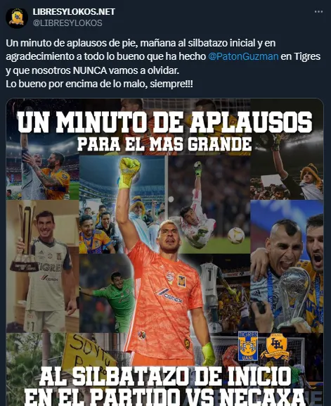“Un minuto de aplausos de pie, mañana al silbatazo inicial y en agradecimiento a todo lo bueno que ha hecho Nahuel Guzmán en Tigres y que nosotros nunca vamos a olvidar. Lo bueno por encima de lo malo, siempre”, dice la invitación de Libres y Lokos en la previa al juego ante Necaxa.
