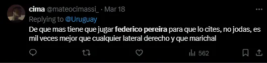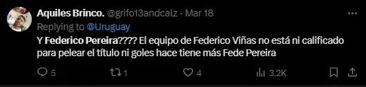 Otros usuarios dirigieron su reclamo comparándolo con otros futbolistas: “Es mil veces mejor que cualquier lateral derecho y que Marichal” y “El equipo de Federico Viñas no está ni calificado para pelear el título ni goles hace tiene más Fede Pereira”. Mucha bronca entre los simpatizantes charrúas por esta situación.
