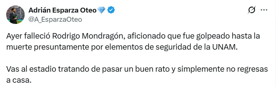 El periodista Adrián Esparza Oteo fue uno de los primeros en dar a conocer la noticia a través de sus redes sociales: “Ayer falleció Rodrigo Mondragón, aficionado que fue golpeado hasta la muerte presuntamente por elementos de seguridad de la UNAM. Vas al estadio tratando de pasar un buen rato y simplemente no regresas a casa”.