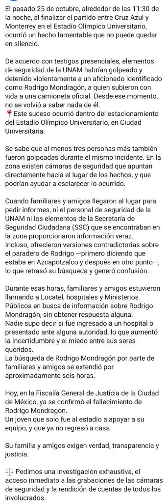 La familia de Rodrigo Mondragón emitió un comunicado en el que relató los hechos ocurridos la noche del 25 de octubre, alrededor de las 23:30 horas, al término del encuentro entre Cruz Azul y Monterrey. “Elementos de seguridad de la UNAM habrían golpeado y detenido violentamente a un aficionado identificado como Rodrigo Mondragón, a quien subieron con vida a una camioneta oficial. Desde ese momento no se volvió a saber nada de él”, detallaron. También señalaron que hubo al menos tres personas más golpeadas durante el mismo incidente, ocurrido en el estacionamiento del recinto deportivo.