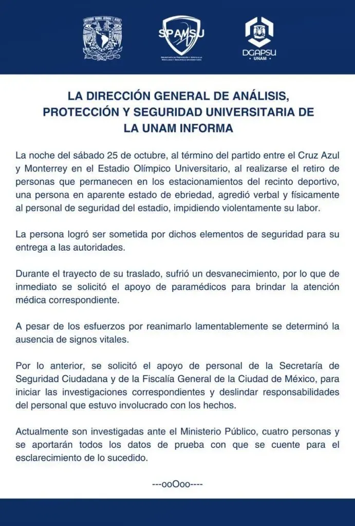 Por su parte, la Dirección General de Análisis, Protección y Seguridad Universitaria de la UNAM ofreció su versión de los hechos: “La noche del 25 de octubre, al término del partido entre Cruz Azul y Monterrey, una persona en aparente estado de ebriedad agredió al personal de seguridad del estadio. Fue sometido para su entrega a las autoridades, pero durante el traslado sufrió un desvanecimiento. A pesar de los esfuerzos médicos, se determinó la ausencia de signos vitales”. La UNAM aseguró que cuatro personas están siendo investigadas ante el Ministerio Público para deslindar responsabilidades.