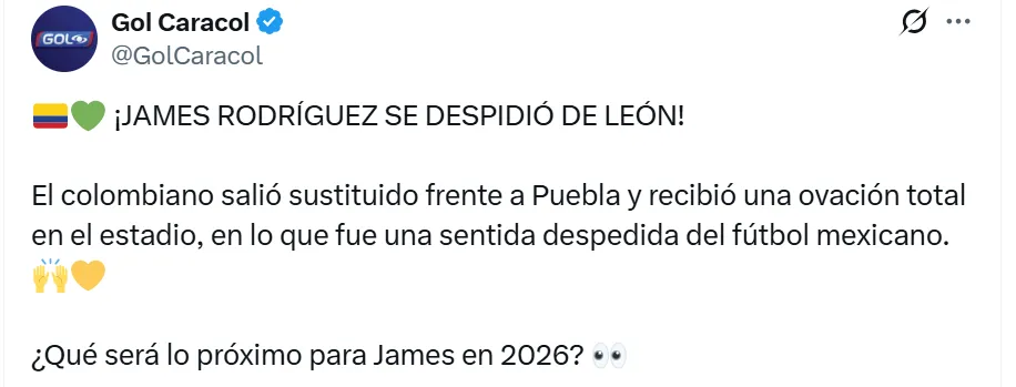 El equipo mexicano, además, perderá a su mejor futbolista, James Rodríguez, para la próxima temporada, ya que se confirmó que el mediocampista no renovará su contrato que finaliza en diciembre y su futuro es una incógnita. Este fin de semana disputó su último encuentro y se despidió con una asistencia de lujo que no sirvió para sumar tres puntos, pero sí para dejar en claro que sigue vigente.
