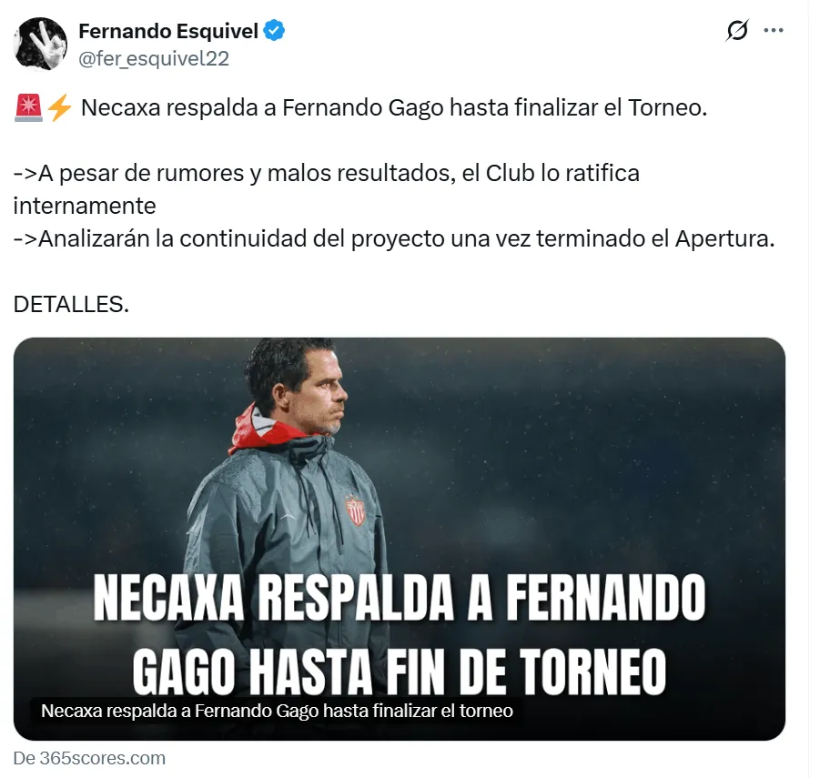 Según lo informado por Fernando Esquivel en 365 Scores México, el club respalda a Fernando Gago y seguirá como entrenador al menos hasta el final del torneo. Además, están evaluando la posibilidad de que continúe a cargo del proyecto más allá del Apertura 2025, dependiendo del desempeño del equipo.