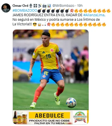 Según el periodista peruano, Omar Oré, dio a conocer que Alianza Lima tiene en el radar regresar a James al futbol sudamericano. El momento que vive la escuadra en su propia liga es muy bueno, ya que se encuentra en el segundo puesto de la Liga 1 con 37 puntos, a sólo dos de Club Universitario de Deportes (39) a justo dos fechas de terminar la temporada.