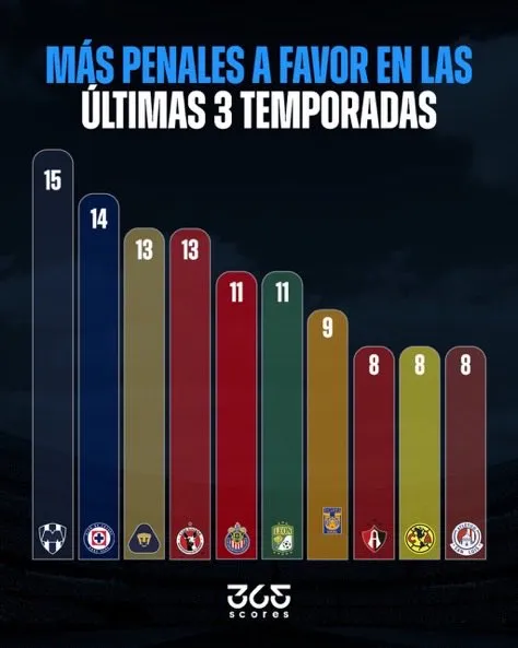Sin embargo, 365Scores dio a conocer un listado en el que se puede ver a los conjuntos de la Liga MX que en los últimos tres torneos han sido más beneficiados con la pena máxima. Aunque claramente, esto no quiere decir que no hayan sido en realidad, por lo que sólo contabiliza los que se han marcado a cada uno de estos equipos.
