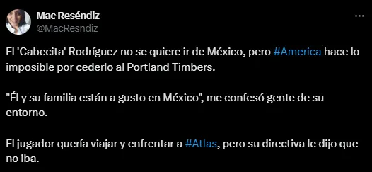 A priori, la lógica indicaría que si no desea irse, todo está dicho y se queda. Pero según el reporte, es la directiva quien pretende darle salida a Rodríguez. “América hace lo imposible por cederlo al Portland”, indicó la periodista en su cuenta de la red social ‘X’. Serán horas claves para definir su futuro.