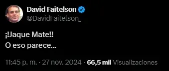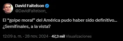 “¡Jaque Mate! O eso parece“, disparó el periodista en la cuenta de su red social ‘X’, donde se mostró muy activo durante toda la jornada de partidos del miércoles de cuartos de final. “El golpe moral del América pudo haber sido definitivo… ¿Semifinales, a la vista?”, agregó Faitelson, que de inmediato generó un sinfín de interacciones, entre aficionados de ambos equipos.