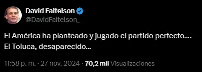 Además, el también conductor elogió al entrenador azulcrema, a quien señaló como responsable de la victoria del local. “La clase maestra de André Jardine… ¡Impresionante! El América ha planteado y jugado el partido perfecto… El Toluca, desaparecido…“, posteó el polémico reportero, sorprendido al igual que muchos por la gran diferencia por contexto y por las bajas de las Águilas para este partido.