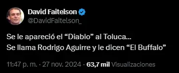 Por último, David Faitelson no perdió ocasión para mofarse del conjunto de Renato Paiva, al hacer un pícaro juego de palabras que encendió a quienes se vieron ofendidos. “Le le apareció el Diablo al Toluca, se llama Rodrigo Aguirre y le dicen El Buffalo“, lanzó el trabajador de TUDN, que habitualmente suele utilizar mucho su cuenta de redes para dar sus opiniones. Eso sí, luego debe aceptar la devolución de sus lectores. ¿Le dará la razón el tiempo o el Toluca remontará la serie y será el hazmerreír de la semana?