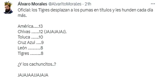 “Oficial: los Tigres desplazan a los pumas en títulos y les hunden cada día más. América 13, Chivas 12 (JAJAJAJAJ), Toluca 10, Cruz Azul 9, León 8, Tigres 8. ¿Y los cachuncitos..? JAJAJAAJJAJAJA”, escribió el narrador de ESPN en su cuenta de Twitter.
