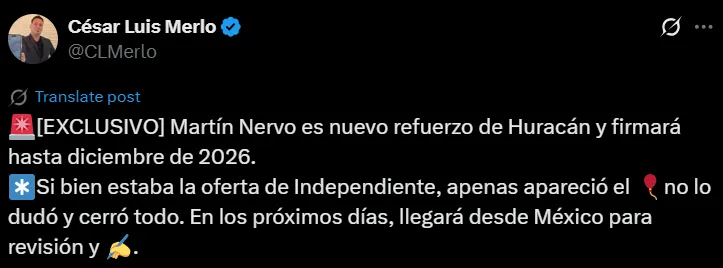 Según informó el periodista César Luis Merlo, Hugo Nervo fichará por Huracán con un contrato hasta diciembre de 2026. Así, en los próximos días se someterá a la revisión médica de rigor para finalmente incorporarse al club porteño en el que ya jugó entre 2015 y 2018. Por otro lado, vale mencionar que, al llegar en condición de agente libre, Atlas no recibirá ninguna compensación económica por este movimiento.
