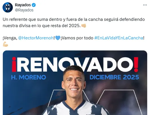 “Agradecemos el compromiso y el aporte de Héctor, quien continuará defendiendo la divisa por lo que resta del 2025“, agregó el club de la Liga MX. De esta manera, Héctor Moreno disputará el Apertura 2025 y la Leagues Cup con Rayados en este segundo semestre del año.