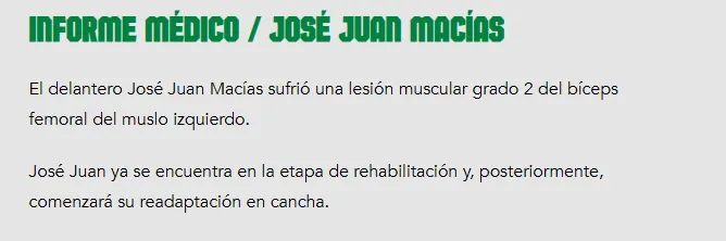 “El delantero José Juan Macías sufrió una lesión muscular grado 2 del bíceps femoral del muslo izquierdo. José Juan ya se encuentra en la etapa de rehabilitación y, posteriormente, comenzará su readaptación en cancha”, comunicó Santos Laguna sobre José Juan Macías, quien estaría al menos 21 días sin jugar con los Guerreros.