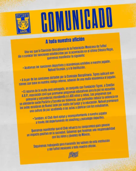 Horas después de que la Comisión Disciplinaria diera a conocer su decisión final con el caso Nahuel Guzmán, desde el conjunto Felino hicieron lo propio. Tal es así que, mediante las redes sociales, Tigres lanzó un comunicado en relación al castigo de la FMF para el portero y, además, anunciando su propia sanción.