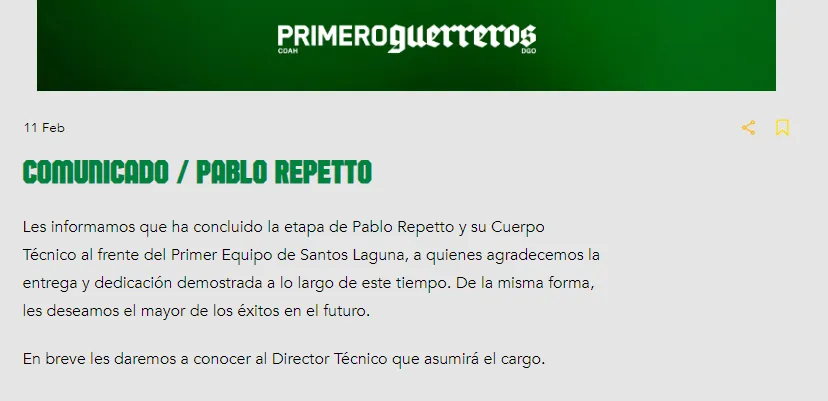 La dolorosa derrota de Santos Laguna en Torreón ante Tigres UANL fue la gota que colmó el vaso y desembocó en la destitución de Pablo Repetto como DT del primer equipo, pese a haber comenzado el Clausura 2024 hace apenas algunas semanas.