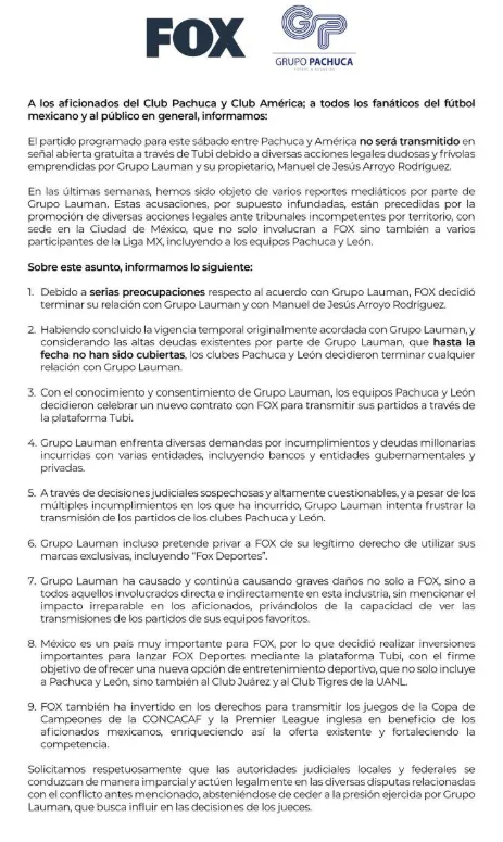 En principio, el juego entre Pachuca y América iba a ser transmitido por la plataforma TUBI. Sin embargo, algunos problemas legales producto de una demanda del Grupo Lauman, comandado por el empresario Manuel de Jesús Arroyo Rodríguez, contra Grupo Pachuca y Fox Corporation por los derechos del encuentro privarán a los aficionados de poder seguir el partido mediante el mencionado servicio de streaming.