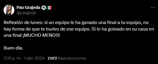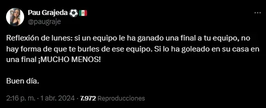 “Reflexión de lunes: si un equipo le ha ganado una final a tu equipo, no hay forma de que te burles de ese equipo, si lo ha goleado en su casa en una final, ¡mucho menos! Buen día”, disparó la reportera Paulina Grajeda, empleada de la señal televisiva, en su cuenta de la red social ‘X’.