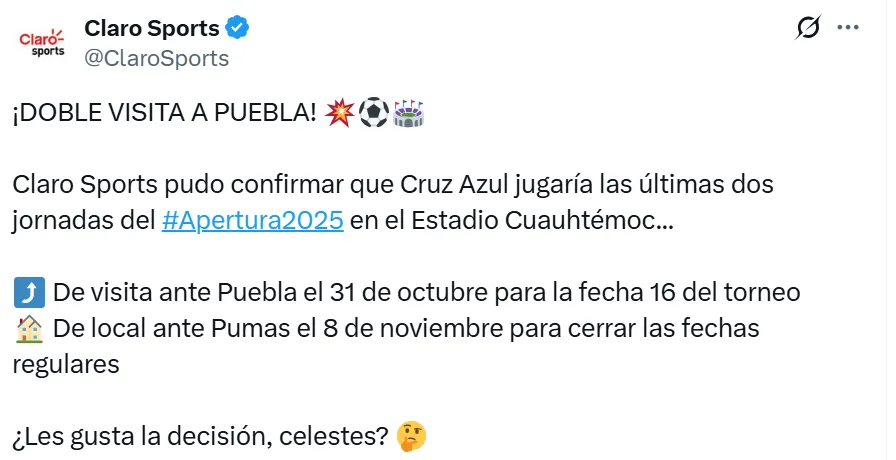 Este fin de semana, ambos disputarán la jornada 16 del Torneo Apertura 2025 y luego se verán las caras en la última jornada. Cruz Azul con el objetivo de terminar lo más arriba posible en la tabla de posiciones, mientras que Pumas buscará entrar en el Play-In.