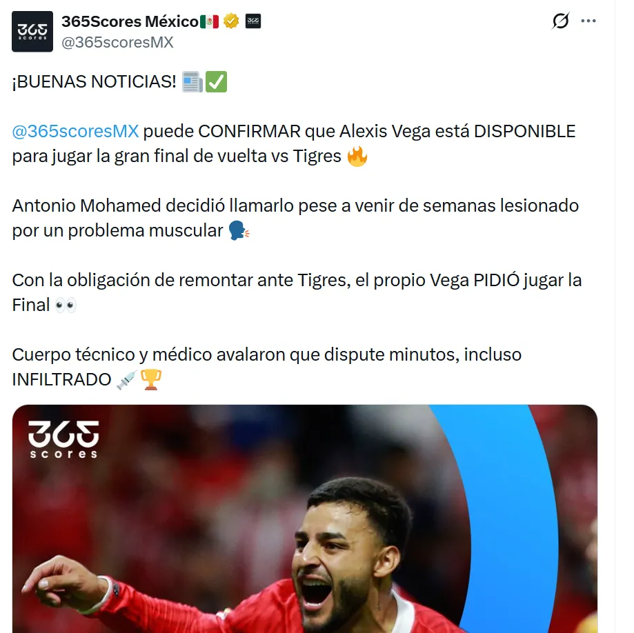 Según pudo confirmar 365Scores México, Alexis Vega está disponible para jugar la gran final de vuelta ante Tigres. Antonio Mohamed decidió incluirlo en la convocatoria a pesar de que el futbolista viene de varias semanas sin actividad, producto de ese problema físico que lo marginó en el tramo final del certamen.