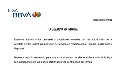 Tras la clausura, la Liga MX emitió un comunicado mediante las redes sociales. “Estamos atentos a los procesos y decisiones tomadas por las autoridades de la Alcaldía Benito Juárez en la Ciudad de México en relación con el Estadio Ciudad de los Deportes”, comenzaron diciendo desde la organización.