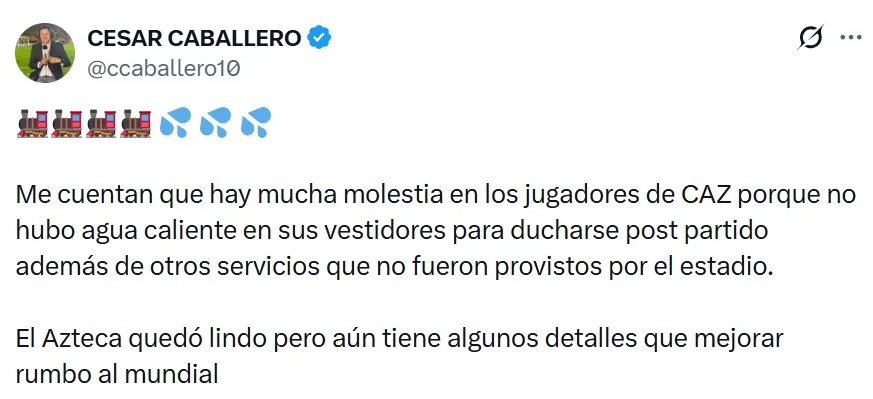 Post partido, el periodista César Caballero reveló que desde La Máquina Celeste hubo varias quejas por lo que ocurrió en el Azteca y los servicios que le brindaron al equipo. “Me cuentan que hay mucha molestia en los jugadores de CAZ porque no hubo agua caliente en sus vestidores para ducharse post partido, además de otros servicios que no fueron provistos por el estadio”, expresó en sus redes sociales.