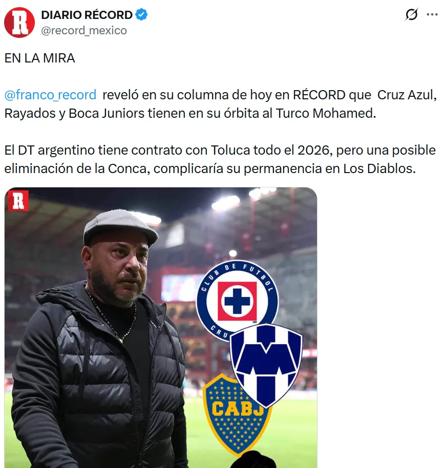 “Toluca apostó fuerte por la Concacaf, en parte están convencidos de que si son campeones, el Turco podría quedarse hasta diciembre para dirigir a los escarlata en la Copa Intercontinental. Sin embargo, la derrota de ayer en Los Ángeles complica el objetivo. Estoy convencido de que la serie contra Pachuca pasa a segundo término y buscarán con todo revertir al LAFC en el Nemesio para tratar de que se quede Mohamed”, expresó Francotirador en su columna de Diario Récord.
