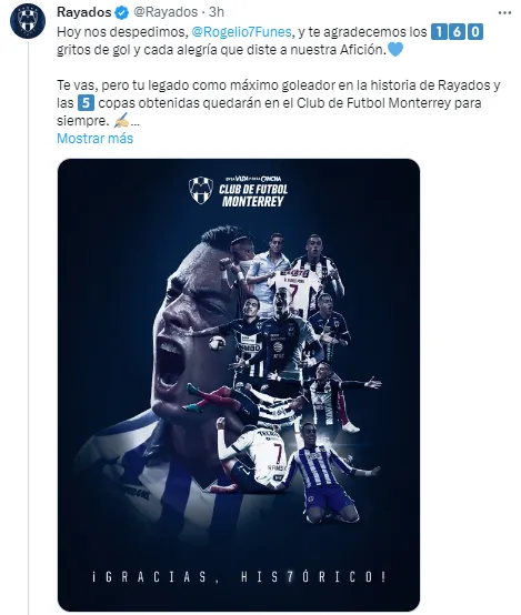 “Hoy nos despedimos, Rogelio Funes Mori, y te agradecemos los 160 gritos de gol y cada alegría que diste a nuestra Afición. Te vas, pero tu legado como máximo goleador en la historia de Rayados y las 5 copas obtenidas quedarán en el Club de Futbol Monterrey para siempre“, escribió la Pandilla en uno de los posteos en sus redes.